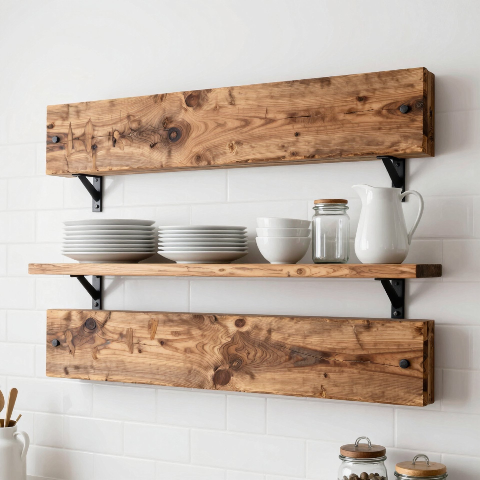 Thick wood planks with visible grain work best in kitchens. Shelves around ten to twelve inches deep comfortably hold plates, bowls, and mixing dishes. Black iron or aged steel brackets reinforce the farmhouse look, while wooden brackets soften the feel in lighter kitchens.