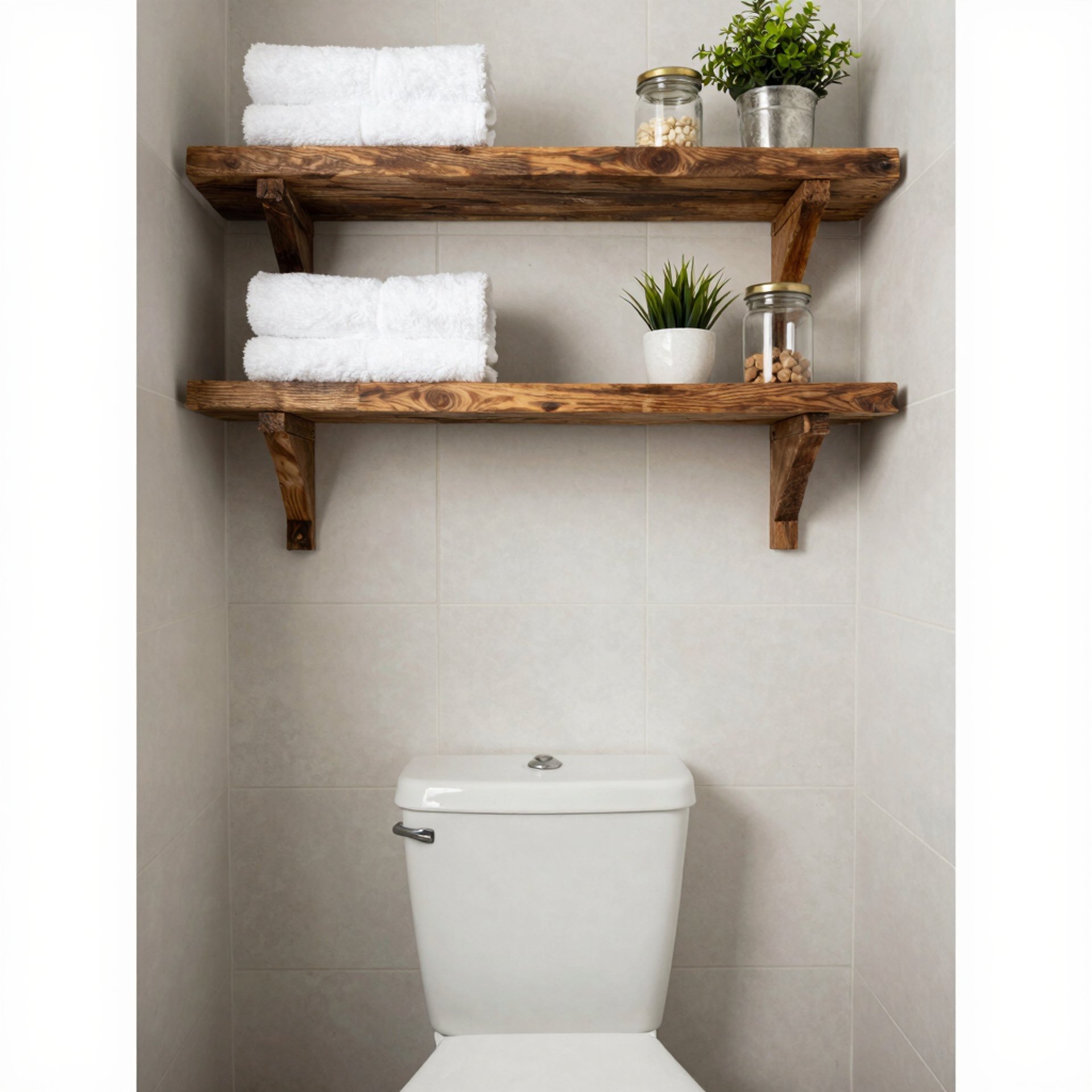 Bathrooms often need storage the most and offer the least space. Rustic wooden shelves provide practical solutions without crowding the room.