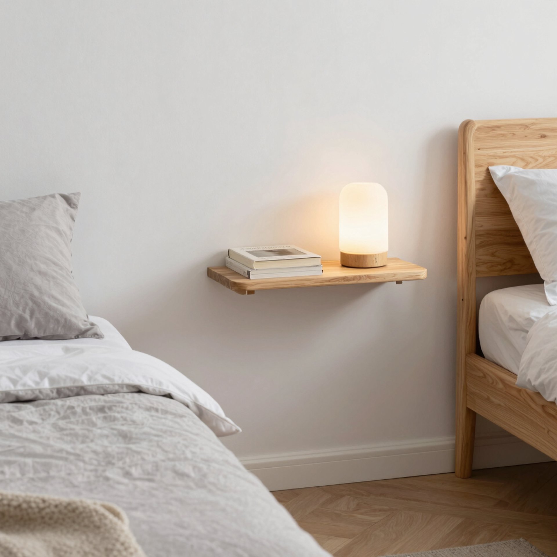 In smaller bedrooms, wall mounted shelves can replace nightstands. A short shelf beside the bed holds a lamp and a few essentials while freeing up floor space.