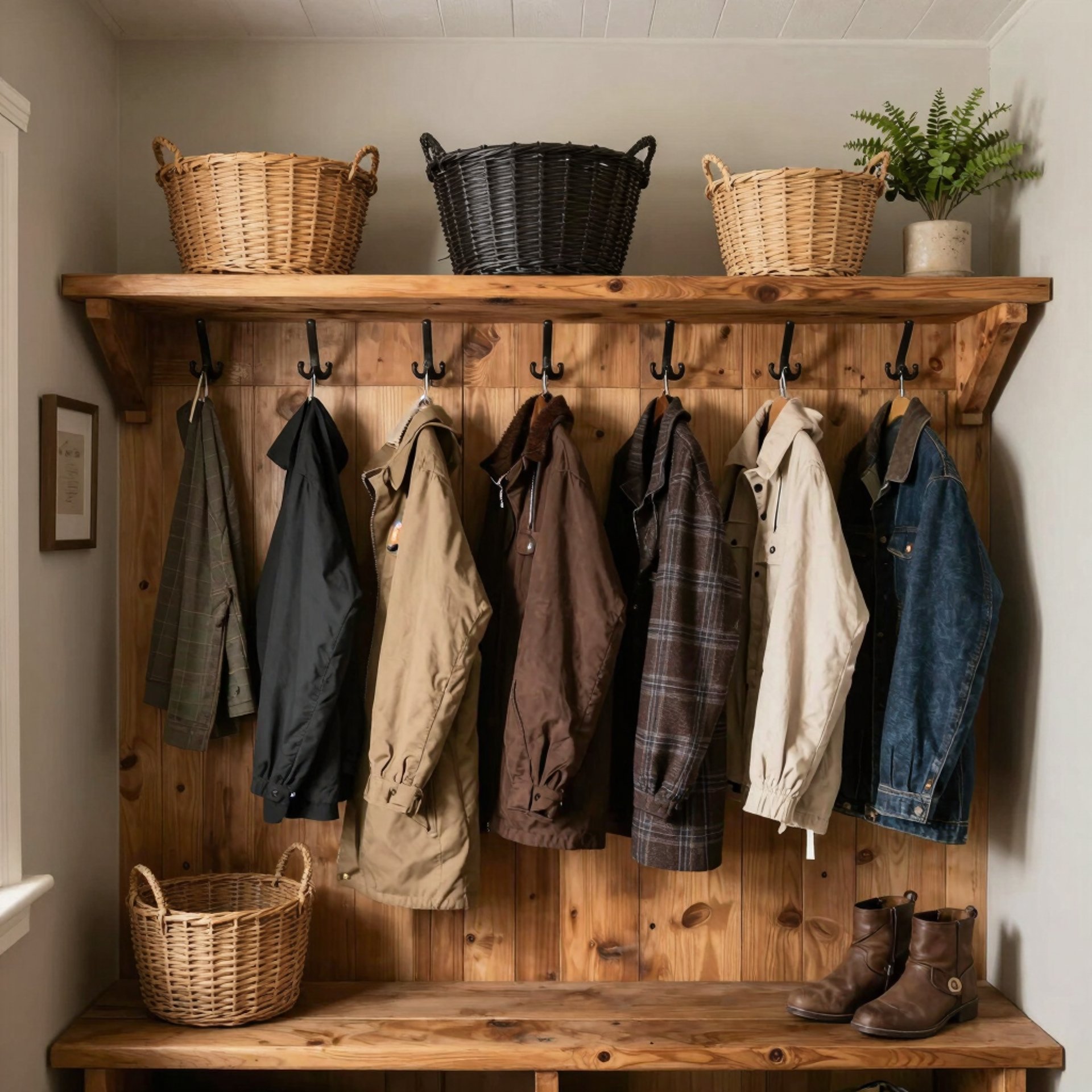 Combined shelf and hook units work especially well. A thick shelf above hooks holds baskets for gloves or scarves, while lower shelves support shoe storage. Wood with visible grain and knots handles heavy use better than smooth finishes.
