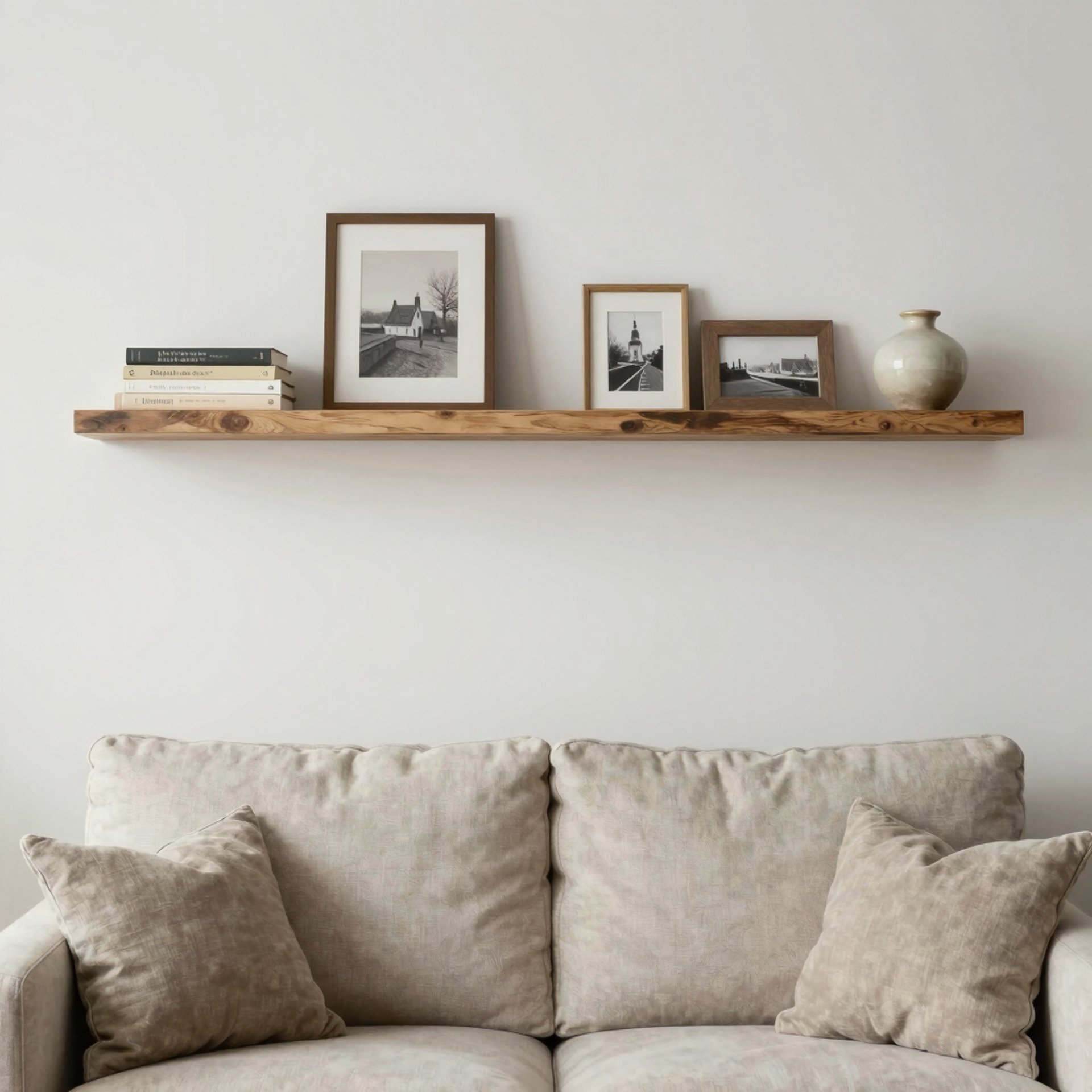 A shelf placed above a sofa or console helps anchor the wall and draw the eye upward. Floating shelves suit cleaner farmhouse interiors, while bracketed shelves lean more traditional. Both styles work as long as spacing stays even and intentional.